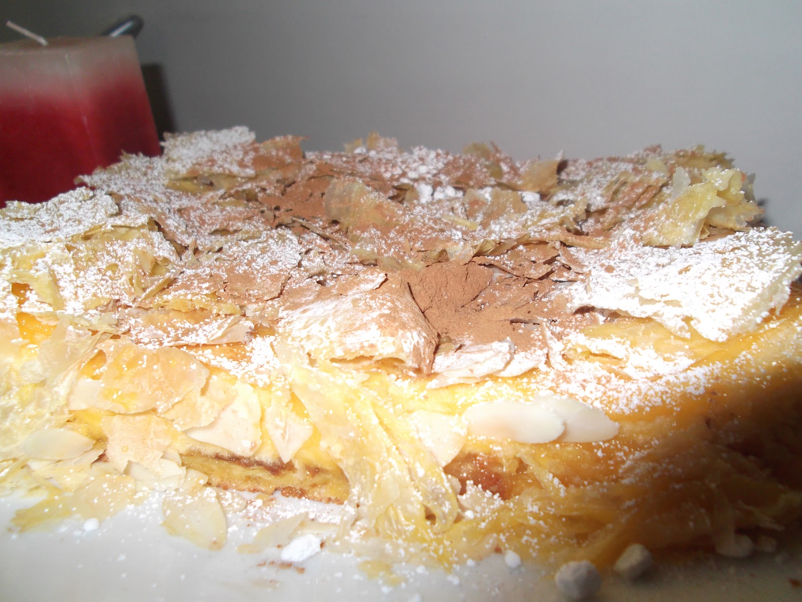 Leve novamente ao lume até engrossar a gosto e comece a montar o bolo fazendo uma camada de massa folhada, creme e bolo, massa folhada, creme e bolo, barrando no final com uma camada de creme.